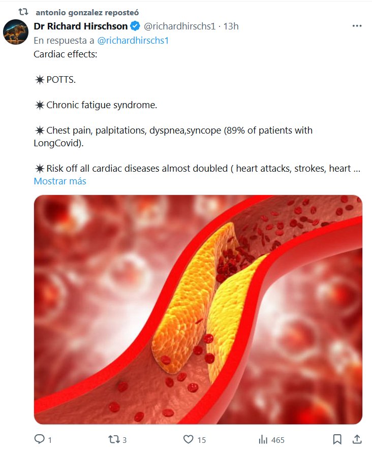 EN INGLÉS Dr. Richard Hirschson @richardhirschs1 Efectos cardíacos: ✴️ Síndrome de fatiga crónica. ✴️ Dolor en el pecho, palpitaciones, disnea, síncope (89 % de los pacientes con Covid prolongado). ✴️ El riesgo de todas las enfermedades cardíacas casi se duplicó (ataques cardíacos, accidentes cerebrovasculares, insuficiencia cardíaca, arritmias, trombosis, miopericarditis). ✴️ El riesgo de muerte cardíaca súbita se duplicó. ✴️ El riesgo de diabetes e hipertensión aumentó.