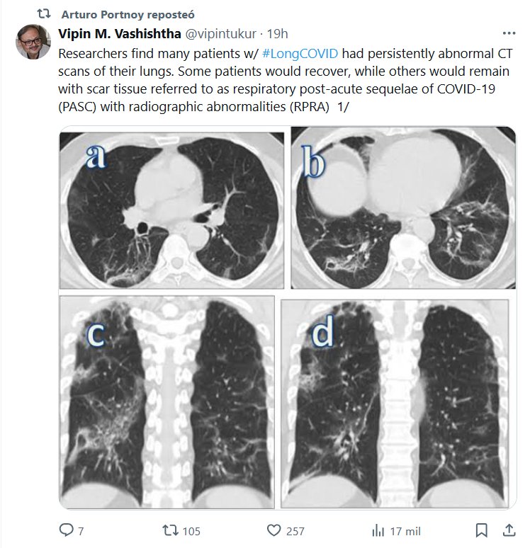 EN INGLÉS Los investigadores descubrieron que muchos pacientes con COVID-19 prolongado presentaban tomografías computarizadas persistentemente anormales de sus pulmones. Algunos pacientes se recuperarían, mientras que otros permanecerían con tejido cicatricial conocido como secuelas respiratorias posagudas de COVID-19 (PASC, por sus siglas en inglés) con anomalías radiográficas (RPRA, por sus siglas en inglés)