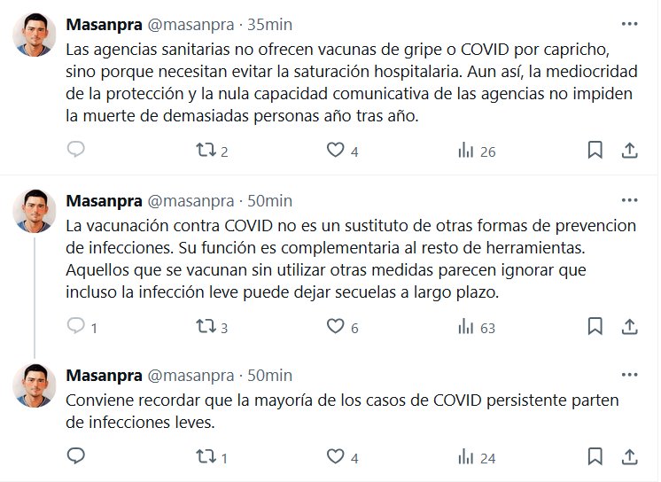 La vacunación contra COVID no es un sustituto de otras formas de prevencion de infecciones. Su función es complementaria al resto de herramientas. Aquellos que se vacunan sin utilizar otras medidas parecen ignorar que incluso la infección leve puede dejar secuelas a largo plazo. Las agencias sanitarias no ofrecen vacunas de gripe o COVID por capricho, sino porque necesitan evitar la saturación hospitalaria. Aun así, la mediocridad de la protección y la nula capacidad comunicativa de las agencias no impiden la muerte de demasiadas personas año tras año.