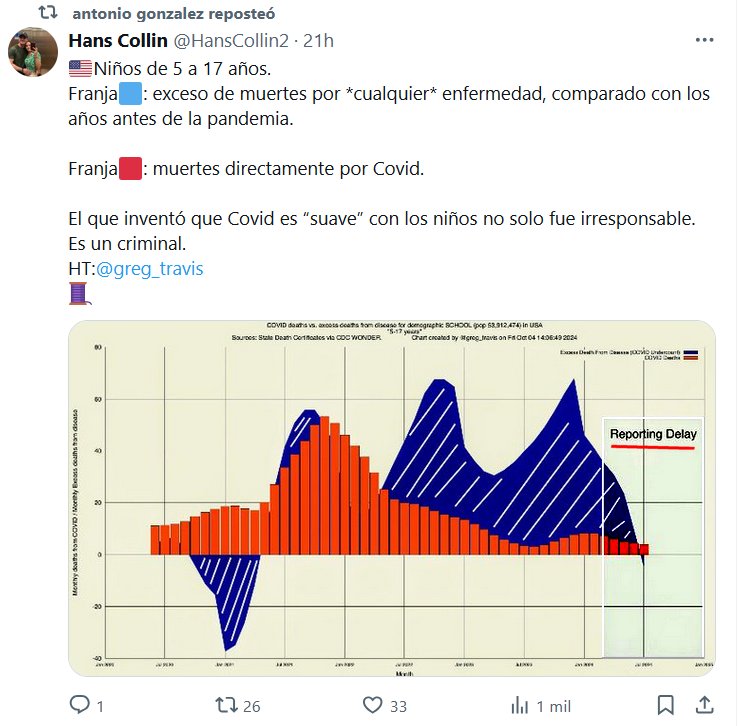 LESA HUMANIDAD 🇺🇸Niños de 5 a 17 años. Franja🟦: exceso de muertes por *cualquier* enfermedad, comparado con los años antes de la pandemia. Franja🟥: muertes directamente por Covid. El que inventó que Covid es “suave” con los niños no solo fue irresponsable. Es un criminal.