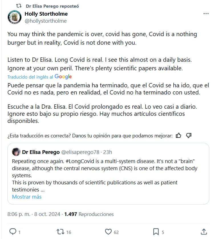 EN INGLÉS Dra. Elisa Perego reposteó Holly Stortholme @hollystortholme Puede pensar que la pandemia ha terminado, que el Covid se ha ido, que el Covid no es nada, pero en realidad, el Covid no ha terminado con usted. Escuche a la Dra. Elisa. El Covid prolongado es real. Lo veo casi a diario. Ignore esto bajo su propio riesgo. Hay muchos artículos científicos disponibles.