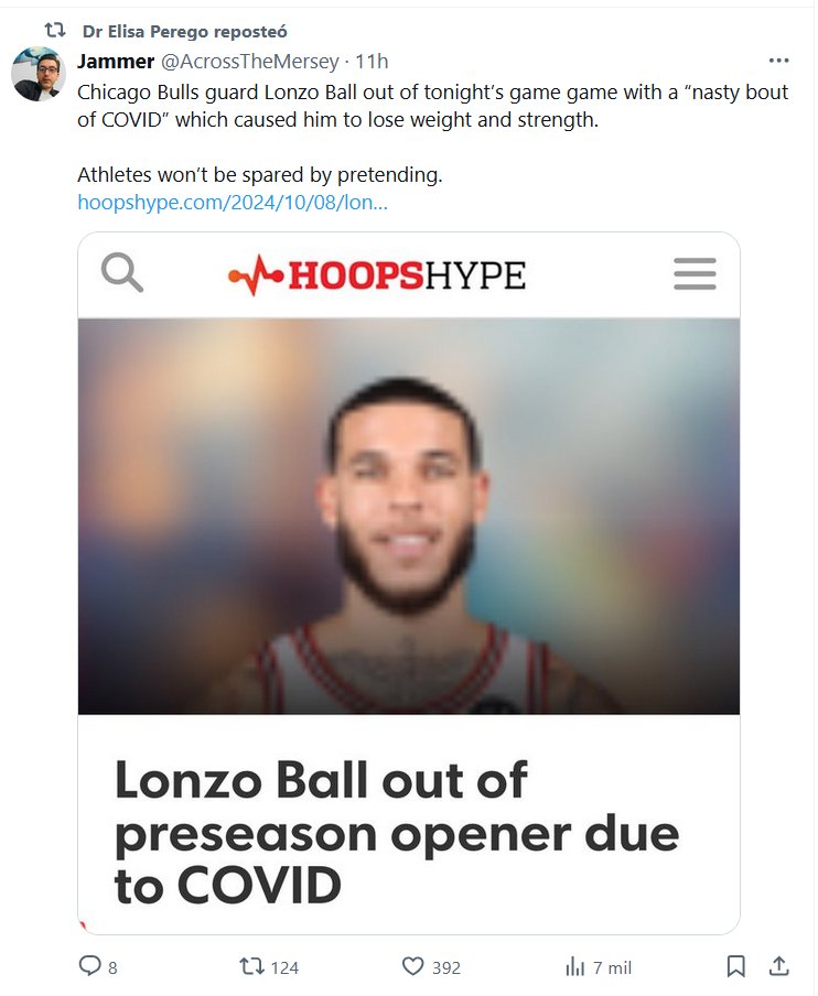 HACER COMO QUE NO HAY COVID NO ESTARÍA RESULTANDO (EN INGLÉS) La Dra. Elisa Perego repostó Jammer @AcrossTheMersey El base de los Chicago Bulls, Lonzo Ball, no jugará esta noche debido a un «desagradable ataque de COVID» que le hizo perder peso y fuerza. Los deportistas no se salvarán fingiendo.