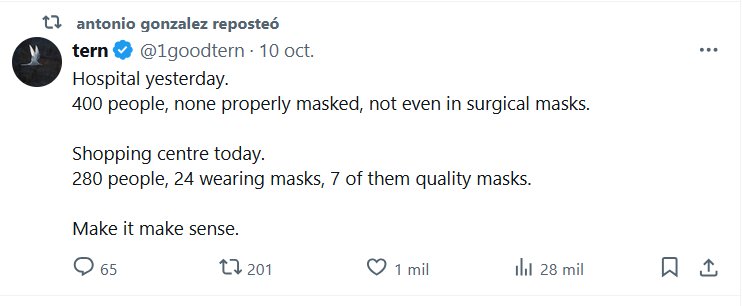 TESTIMONIOS (EN INGLÉS) Ayer en el hospital. 400 personas, ninguna de ellas con mascarilla, ni siquiera quirúrgica. Hoy en el centro comercial. 280 personas, 24 con mascarilla, 7 de ellas de calidad. HAZ Que tenga sentido.