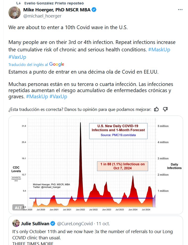 EN INGLÉS Estamos a punto de entrar en una décima ola de Covid en EE.UU. Muchas personas están en su tercera o cuarta infección. Las infecciones repetidas aumentan el riesgo acumulativo de enfermedades crónicas y graves. #MaskUp #VaxUp