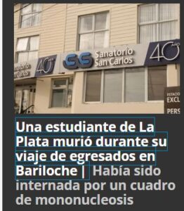 POSTCOVID HACE ESTRAGOS Una estudiante de La Plata murió durante su viaje de egresados en Bariloche Había sido internada por un cuadro de mononucleosis Posted on octubre 13, 2024 por coronado https://www.pagina12.com.ar/774355-una-estudiante-de-la-plata-murio-durante-su-viaje-de-egresad