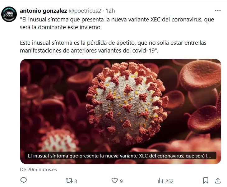 «El inusual síntoma que presenta la nueva variante XEC del coronavirus, que será la dominante este invierno. Este inusual síntoma es la pérdida de apetito, que no solía estar entre las manifestaciones de anteriores variantes del covid-19»