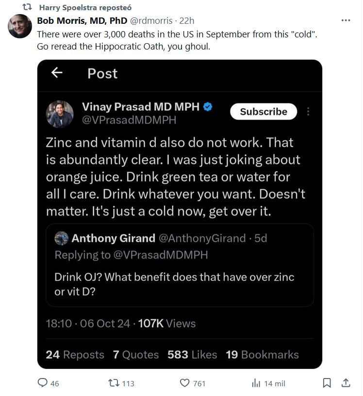 GRIPALIZACIÓN: HACER PASAR COVID POR GRIPE (EN INGLÉS) Bob Morris, MD, PhD @rdmorris En septiembre hubo más de 3000 muertes en los EE. UU. a causa de este «resfriado». Ve a leer el juramento hipocrático, demonio.