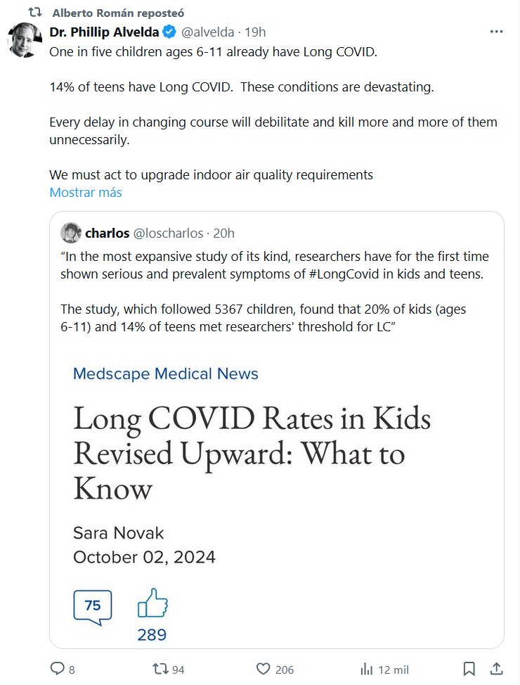 LESA HUMANIDAD (EN INGLÉS) Dr. Phillip Alvelda @alvelda Uno de cada cinco niños de entre 6 y 11 años ya padece COVID persistente. El 14 % de los adolescentes padece COVID persistente. Estas afecciones son devastadoras. Cada demora en cambiar de rumbo debilitará y matará a más y más de ellos innecesariamente.
