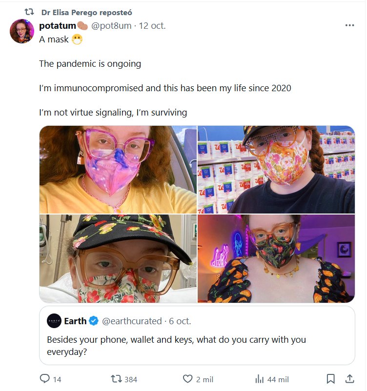 TESTIMONIOS (EN INGLÉS) Una mascarilla 😷 La pandemia continúa Tengo el sistema inmunológico comprometido y así ha sido mi vida desde 2020 No estoy haciendo alarde de virtud, estoy sobreviviendo