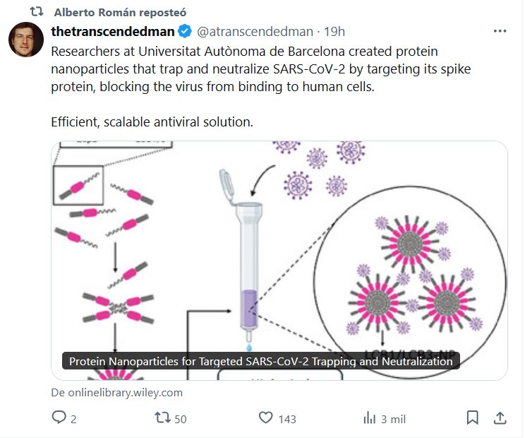 CUALQUIER COSA MENOS MASCARILLA! EN INGLÉS Investigadores de la Universitat Autònoma de Barcelona han creado nanopartículas proteicas que atrapan y neutralizan el SARS-CoV-2 al dirigirse a su proteína de pico, impidiendo que el virus se una a las células humanas. Solución antiviral eficiente y escalable.