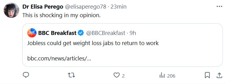 PESTE ESCLAVISTA CAPITALISTA CONSUMISTA (EN INGLÉS) Dra. Elisa Perego @elisaperego78 En mi opinión, esto es impactante. Cita BBC Breakfast @BBCBreakfast Las personas sin empleo podrían recibir inyecciones para bajar de peso y volver a trabajar