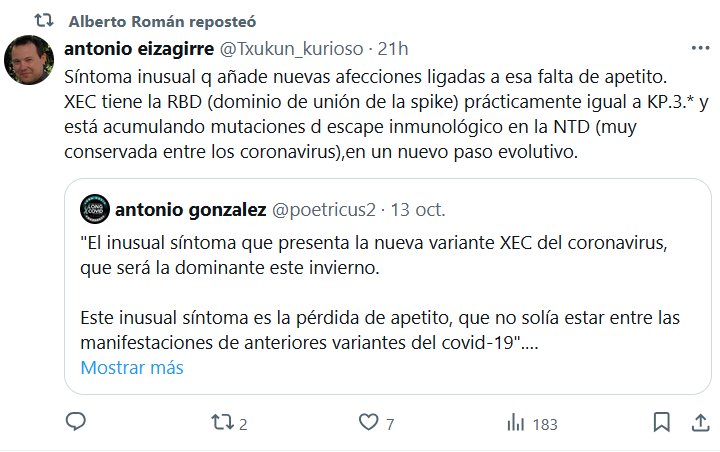 Síntoma inusual q añade nuevas afecciones ligadas a esa falta de apetito. XEC tiene la RBD (dominio de unión de la spike) prácticamente igual a KP.3.* y está acumulando mutaciones d escape inmunológico en la NTD (muy conservada entre los coronavirus),en un nuevo paso evolutivo.
