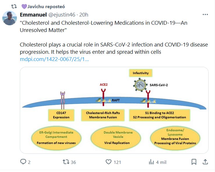 EN INGLÉS «El colesterol y los medicamentos para reducirlo en la COVID-19: una cuestión sin resolver» El colesterol desempeña un papel crucial en la infección por SARS-CoV-2 y la progresión de la enfermedad por COVID-19. Ayuda al virus a entrar y propagarse dentro de las células