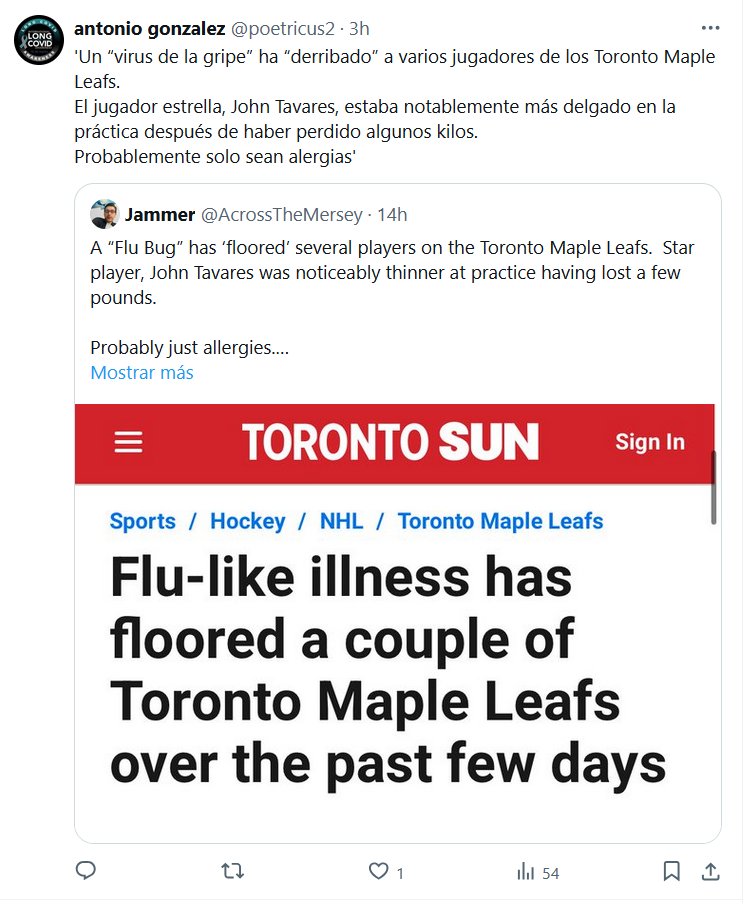 NODIGAMOSCOVID HACE ESTRAGOS ‘Un “virus de la gripe” ha “derribado” a varios jugadores de los Toronto Maple Leafs. El jugador estrella, John Tavares, estaba notablemente más delgado en la práctica después de haber perdido algunos kilos. Probablemente solo sean alergias’