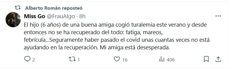 TESTIMONIOS El hijo (6 años) de una buena amiga cogió turalemia este verano y desde entonces no se ha recuperado del todo: fatiga, mareos, febrícula…Seguramente haber pasado el covid unas cuantas veces no está ayudando en la recuperación. Mi amiga está desesperada.