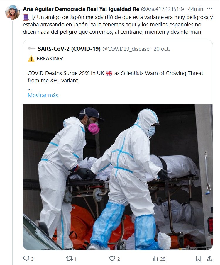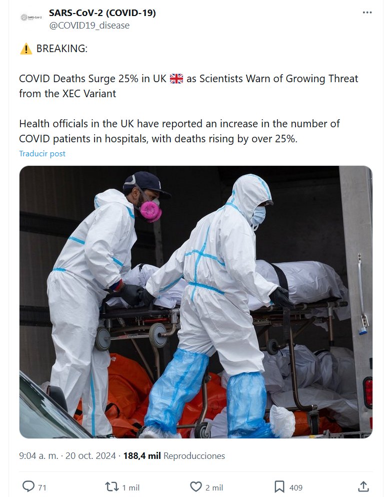 EN INGLÉS ⚠️ ÚLTIMA HORA: Las muertes por COVID aumentan un 25 % en el Reino Unido 🇬🇧 mientras los científicos advierten sobre la creciente amenaza de la variante XEC > Un amigo de Japón me advirtió de que esta variante era muy peligrosa y estaba arrasando en Japón. Ya la tenemos aquí y los medios españoles no dicen nada del peligro que corremos, al contrario, mienten y desinforman