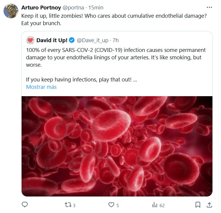EN INGLÉS El 100 % de cada infección por SARS-COV-2 (COVID-19) causa algún daño permanente en el revestimiento endotelial de las arterias. Es como fumar, pero peor. Posted on octubre 21, 2024 por coronado