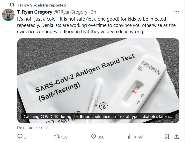 COVID ES MORTAL, NO ES UN RESFRÍO (EN INGLÉS) Harry Spoelstra reposteó T. Ryan Gregory @TRyanGregory No es «solo un resfriado». No es seguro (y mucho menos bueno) que los niños se infecten repetidamente. Los negacionistas están trabajando horas extra para convencerte de lo contrario, mientras la evidencia continúa demostrando que se equivocaron por completo.