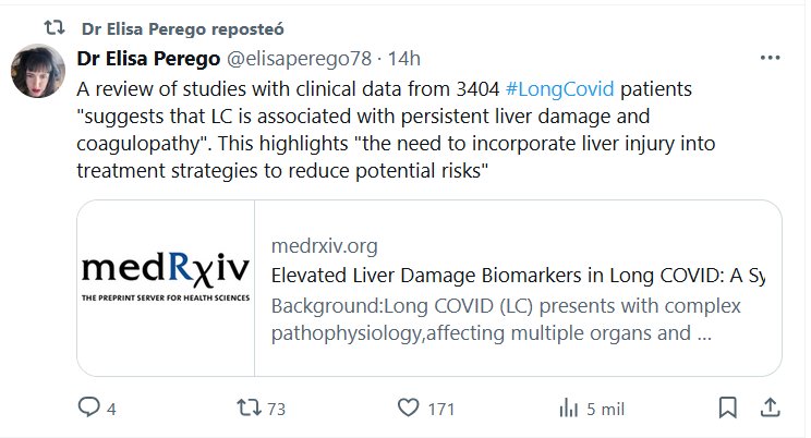 EN INGLÉS Dra. Elisa Perego @elisaperego78 Una revisión de estudios con datos clínicos de 3404 pacientes con #CovidLong “sugiere que la LC se asocia con daño hepático persistente y coagulopatía”. Esto pone de relieve “la necesidad de incorporar la lesión hepática en las estrategias de tratamiento para reducir los riesgos potenciales”