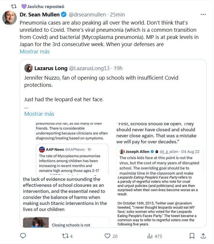 POSTCOVID HACE ESTRAGOS (EN INGLÉS) Dr. Sean Mullen @drseanmullen Los casos de neumonía también están alcanzando su punto máximo en todo el mundo. No piense que eso no está relacionado con el COVID. Hay neumonía viral (que es una transición común del COVID) y bacteriana (neumonía por micoplasma). La MP está en niveles máximos en Japón por tercera semana consecutiva.
