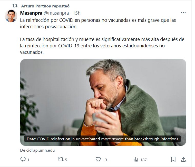 La reinfección por COVID en personas no vacunadas es más grave que las infecciones posvacunación. La tasa de hospitalización y muerte es significativamente más alta después de la reinfección por COVID-19 entre los veteranos estadounidenses no vacunados.
