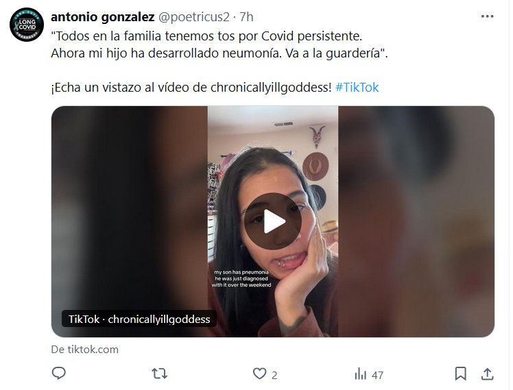 TESTIMONIOS «Todos en la familia tenemos tos por Covid persistente. Ahora mi hijo ha desarrollado neumonía. Va a la guardería». Posted on octubre 24, 2024 por coronado https://www.tiktok.com/@chronicallyillgoddess/video/7428329043851808031?_t=8qoMAEa7Ob2&_r=1