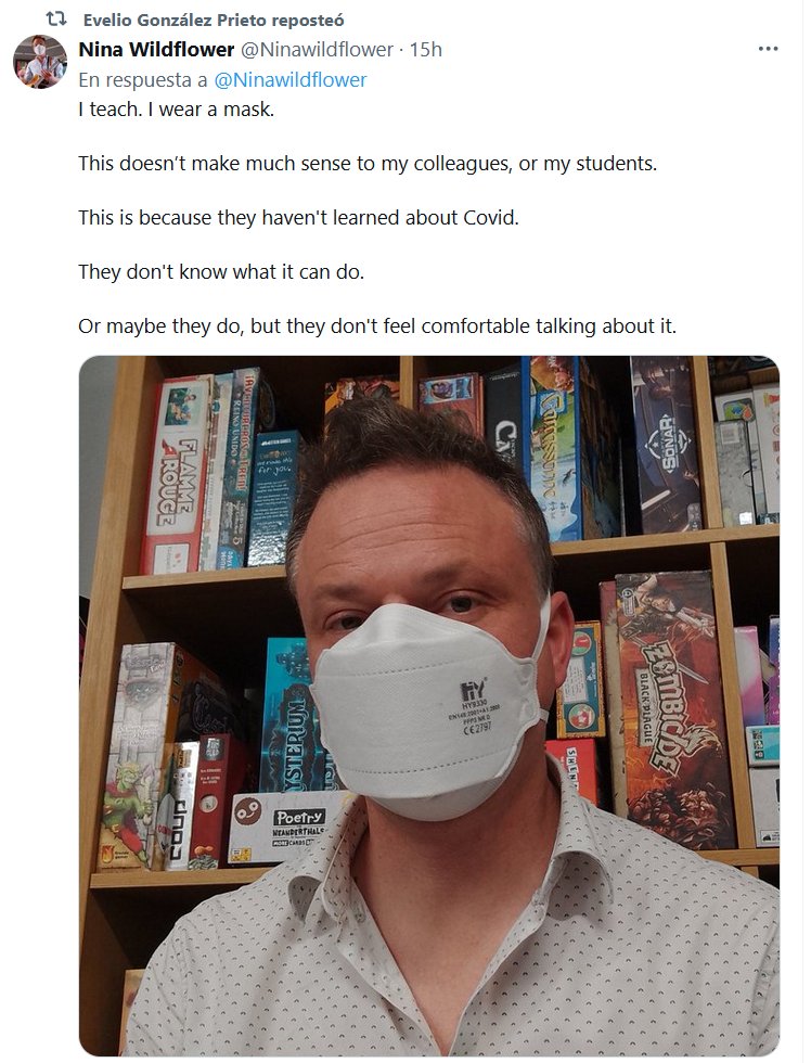 UN VERDADERO MAESTRO! TESTIMONIOS (EN INGLÉS) Doy clases y uso mascarilla. Esto no tiene mucho sentido para mis compañeros ni para mis alumnos. Esto se debe a que no han aprendido nada sobre el Covid. No saben lo que puede hacer. O tal vez sí, pero no se sienten cómodos hablando de ello. (Hombre con mascarilla FFP3)
