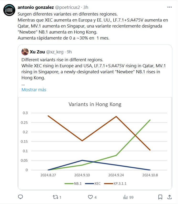 Y EL «FIN DE PANDEMIA»? Surgen diferentes variantes en diferentes regiones. Mientras que XEC aumenta en Europa y EE. UU., LF.7.1+S:A475V aumenta en Qatar, MV.1 aumenta en Singapur, una variante recientemente designada «Newbee» NB.1 aumenta en Hong Kong. Aumenta rápidamente de 0 a ~30% en 1 mes