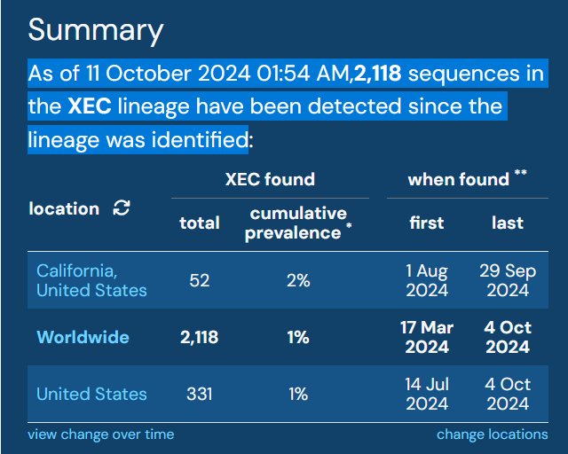 EN INGLÉS Al 11 de octubre de 2024 a las 01:54 a. m., se han detectado 2118 secuencias en el linaje XEC desde que se identificó el linaje Posted on octubre 25, 2024 por coronado NO ENCUENTRO DATOS ACTUALIZADOS