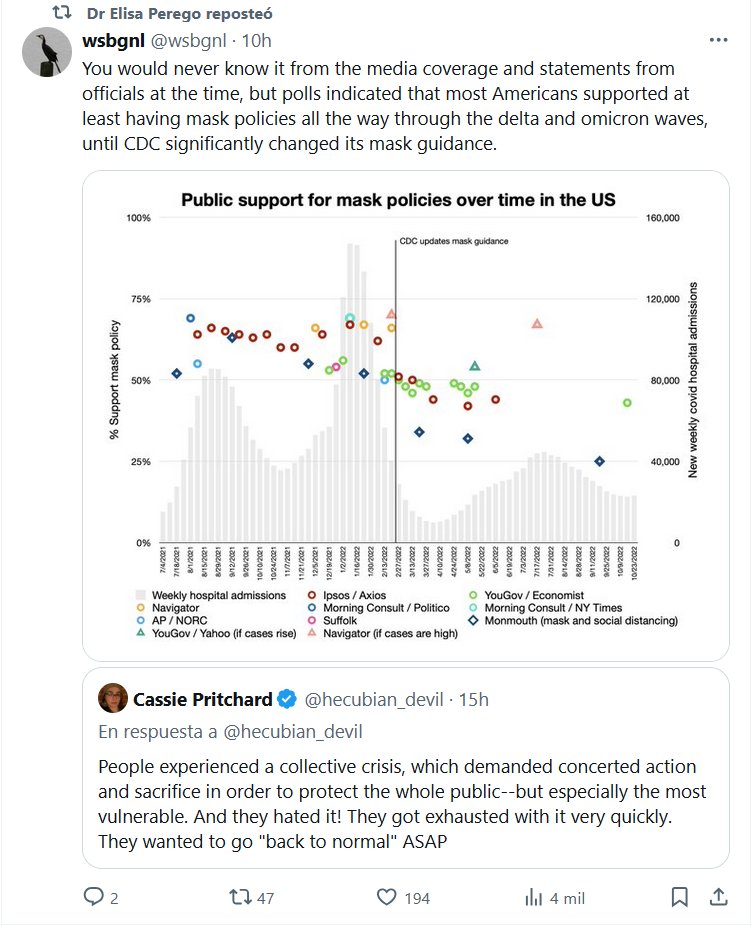 EN INGLÉS La Dra. Elisa Perego reposteó wsbgnl @wsbgnl Nunca lo sabrías a partir de la cobertura de los medios y las declaraciones de los funcionarios en ese momento, pero las encuestas indicaron que la mayoría de los estadounidenses apoyaron al menos tener políticas de uso de mascarillas durante las olas de la variante delta y la ómicron, hasta que los CDC cambiaron significativamente sus pautas sobre el uso de mascarillas.