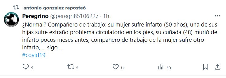 POSTCOVID HACE ESTRAGOS: TESTIMONIOS ¿Normal? Compañero de trabajo: su mujer sufre infarto (50 años), una de sus hijas sufre extraño problema circulatorio en los pies, su cuñada (48) murió de infarto pocos meses antes, compañero de trabajo de la mujer sufre otro infarto, … sigo … #covid19