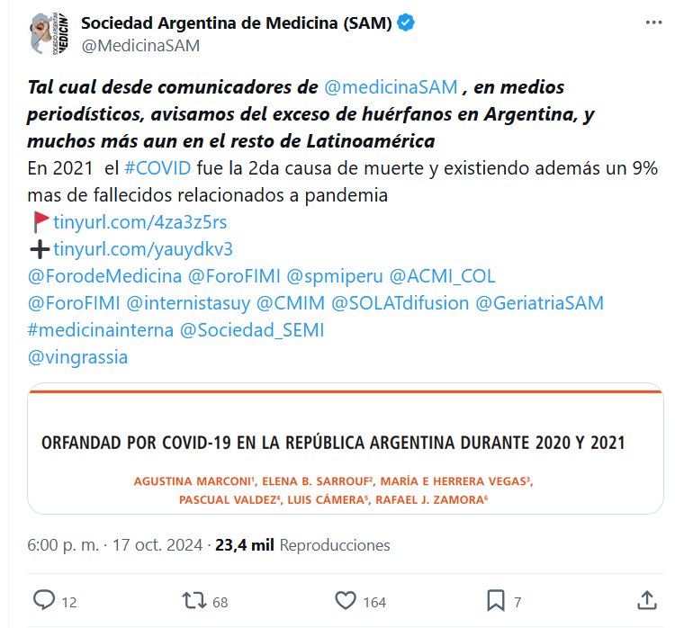 Sociedad Argentina de Medicina (SAM) @MedicinaSAM Tal cual desde comunicadores de @medicinaSAM , en medios periodísticos, avisamos del exceso de huérfanos en Argentina, y muchos más aun en el resto de Latinoamérica En 2021 el #COVID fue la 2da causa de muerte y existiendo además un 9% mas de fallecidos relacionados a pandemia
