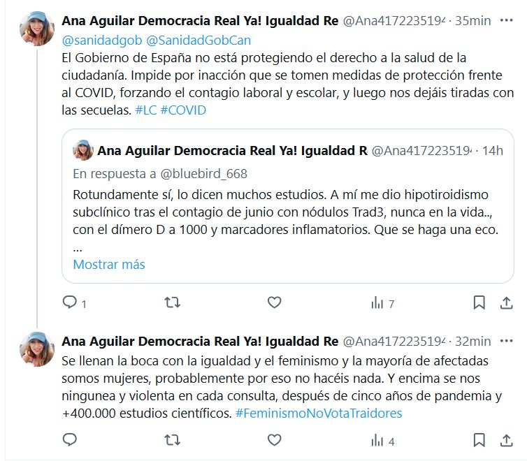 Y ASÍ EN TODOS LOS PAÍSES Ana Aguilar Democracia Real Ya! Igualdad Real Ya! @Ana417223519476 · @sanidadgob @SanidadGobCan El Gobierno de España no está protegiendo el derecho a la salud de la ciudadanía. Impide por inacción que se tomen medidas de protección frente al COVID, forzando el contagio laboral y escolar, y luego nos dejáis tiradas con las secuelas. #LC #COVID