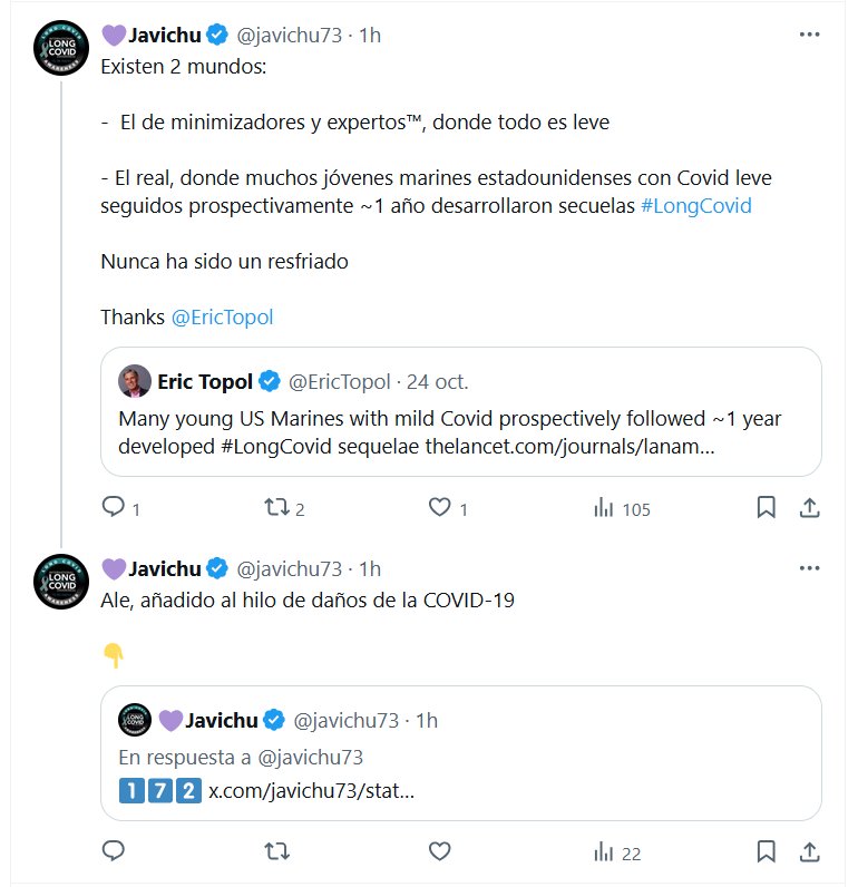 💜Javichu @javichu73 · Existen 2 mundos: – El de minimizadores y expertos™, donde todo es leve – El real, donde muchos jóvenes marines estadounidenses con Covid leve seguidos prospectivamente ~1 año desarrollaron secuelas #LongCovid Nunca ha sido un resfriado