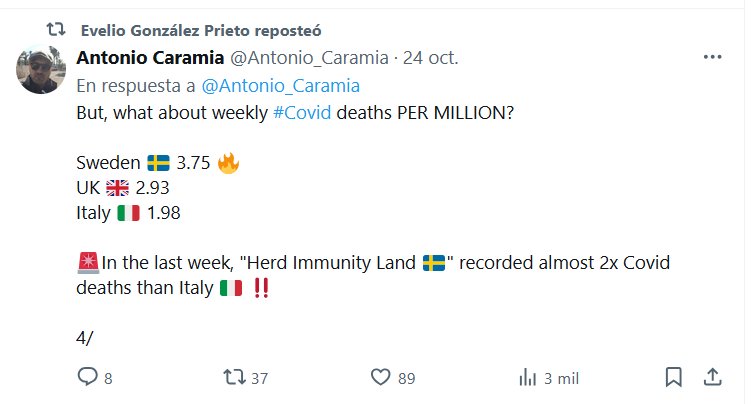 EN INGLÉS Pero, ¿qué pasa con las muertes semanales por #Covid POR MILLÓN? Suecia 🇸🇪 3,75 🔥 Reino Unido 🇬🇧 2,93 Italia 🇮🇹 1,98 🚨En la última semana, «La tierra de la inmunidad colectiva 🇸🇪» registró casi el doble de muertes por Covid que Italia 🇮🇹 ‼️