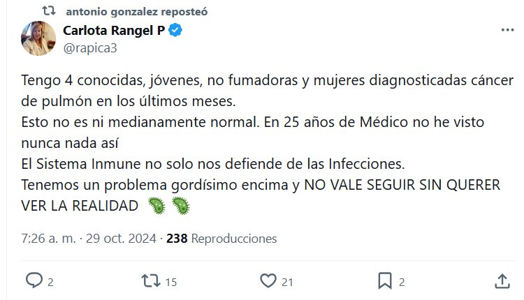 NODIGAMOSCOVID HACE ESTRAGOS Tengo 4 conocidas, jóvenes, no fumadoras y mujeres diagnosticadas cáncer de pulmón en los últimos meses. Esto no es ni medianamente normal. En 25 años de Médico no he visto nunca nada así El Sistema Inmune no solo nos defiende de las Infecciones. Tenemos un problema gordísimo encima y NO VALE SEGUIR SIN QUERER VER LA REALIDAD 🦠 🦠
