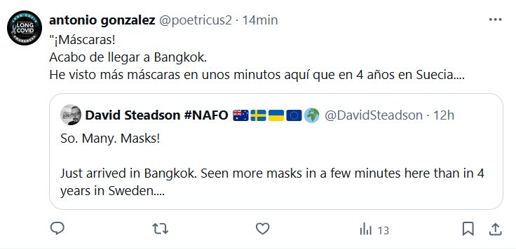TESTIMONIOS ¡Máscaras! Acabo de llegar a Bangkok. He visto más máscaras en unos minutos aquí que en 4 años en Suecia…. Posted on octubre 30, 2024 por coronado APRENDAN SUECOS!