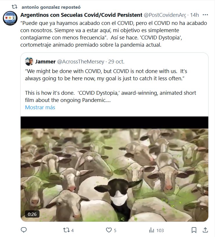 Argentinos con Secuelas Covid/Covid Persistente @PostCovidenArg · “Puede que ya hayamos acabado con el COVID, pero el COVID no ha acabado con nosotros. Siempre va a estar aquí, mi objetivo es simplemente contagiarme con menos frecuencia”. Así se hace. ‘COVID Dystopia’, cortometraje animado premiado sobre la pandemia actual.