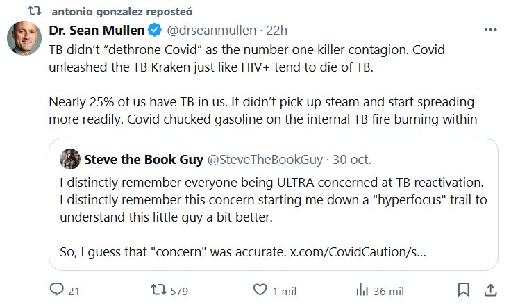 EN INGLÉS Dr. Sean Mullen @drseanmullen La tuberculosis no “destronó al Covid” como la principal enfermedad contagiosa. El Covid desató al Kraken de la tuberculosis, al igual que el [QUE TIENE] VIH+ tiende a morir de tuberculosis. Casi el 25 % de nosotros tenemos tuberculosis. No cobró impulso ni comenzó a propagarse con mayor facilidad. El Covid echó gasolina al fuego interno de la tuberculosis que ardía en nuestro interior
