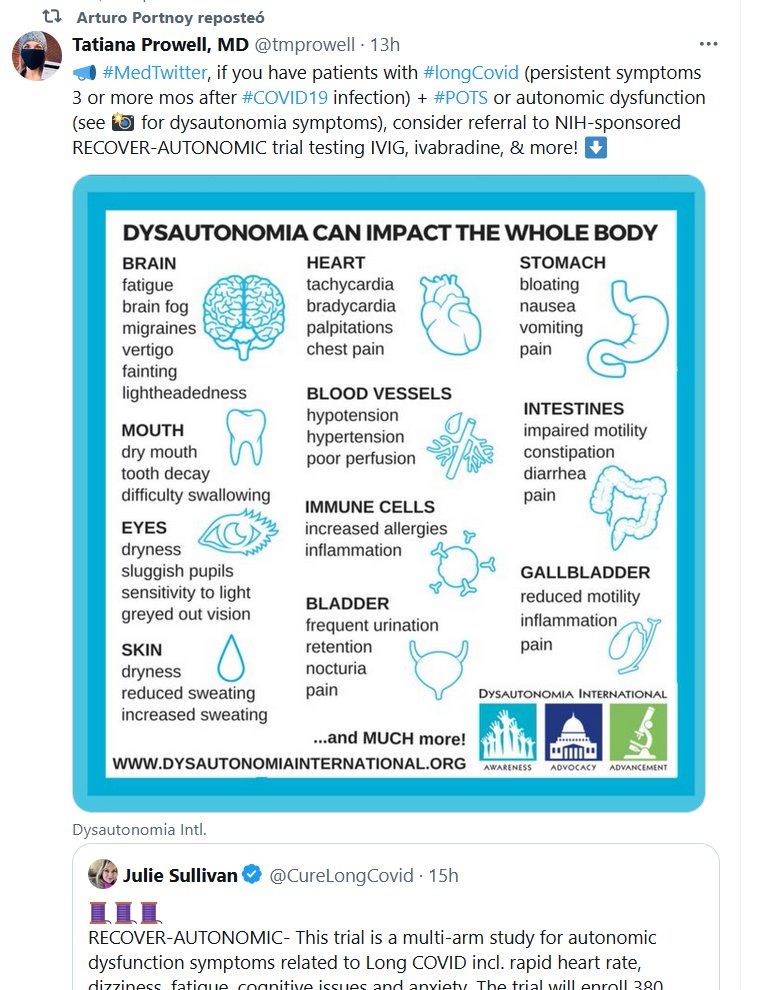 EN INGLÉS DRA. Tatiana Prowell, MD @tmprowell 📣 #MedTwitter, si tienes pacientes con #Covidlargo (síntomas persistentes 3 o más meses después de la infección por #COVID19) + #POTS o disfunción autonómica (consulta 📸 para conocer los síntomas de disautonomía), considera derivarlos al ensayo RECOVER-AUTONOMIC patrocinado por los NIH, que prueba inmunoglobulina intravenosa, ivabradina y más. ⬇️