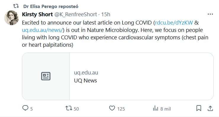 EN INGLÉS La Dra. Elisa Perego reposteó Kirsty Short @K_RenfreeShort Nos complace anunciar que nuestro último artículo sobre COVID prolongado (https://rdcu.be/dYzKW y https://uq.edu.au/news/) se publicó en Nature Microbiology. En este artículo, nos centramos en las personas que viven con COVID prolongado y experimentan síntomas cardiovasculares (dolor en el pecho o palpitaciones cardíacas)