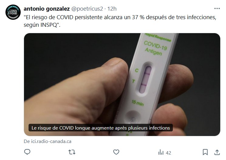 NO TE SUICIDES CON LA RULETA RUSA COVID: USA MASCARILLA «El riesgo de COVID persistente alcanza un 37 % después de tres infecciones, según INSPQ» Posted on octubre 31, 2024 por coronado https://ici.radio-canada.ca/nouvelle/2116352/covid-longue-sras-cov2-pandemie-risque