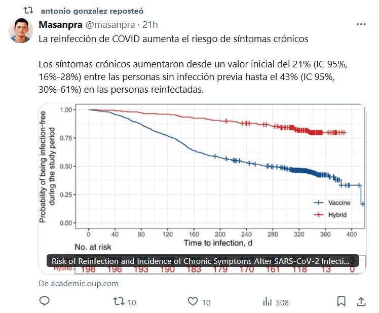 La reinfección de COVID aumenta el riesgo de síntomas crónicos Los síntomas crónicos aumentaron desde un valor inicial del 21% (IC 95%, 16%-28%) entre las personas sin infección previa hasta el 43% (IC 95%, 30%-61%) en las personas reinfectadas.