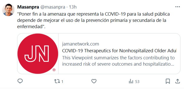 «Poner fin a la amenaza que representa la COVID-19 para la salud pública depende de mejorar el uso de la prevención primaria y secundaria de la enfermedad» Posted on noviembre 5, 2024 por coronado https://jamanetwork.com/journals/jama/fullarticle/2824607?guestAccessKey=1d255b5e-ca20-4715-8d22-5fa7922bb934&utm_source=silverchair&utm_medium=email&utm_campaign=article_alert-jama&utm_content=mostreadwidget&utm_term=110424&adv=000004819496