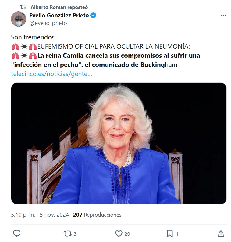 NODIGAMOSCOVID HACE ESTRAGOS Alberto Román reposteó Evelio González Prieto @evelio_prieto Son tremendos 🫁✴️🫁EUFEMISMO OFICIAL PARA OCULTAR LA NEUMONÍA: 🫁✴️🫁La reina Camila cancela sus compromisos al sufrir una «infección en el pecho»: el comunicado de Buckingham
