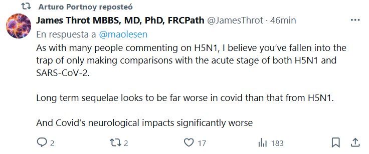 EN INGLÉS: DR. James Throt MBBS, MD, PhD, FRCPath @JamesThrot En respuesta a @maolesen Al igual que muchas personas que comentan sobre el H5N1, creo que ha caído en la trampa de hacer comparaciones únicamente con la etapa aguda tanto del H5N1 como del SARS-CoV-2. Las secuelas a largo plazo parecen ser mucho peores en el caso de la COVID que las del H5N1. Y los impactos neurológicos de la COVID son significativamente peores