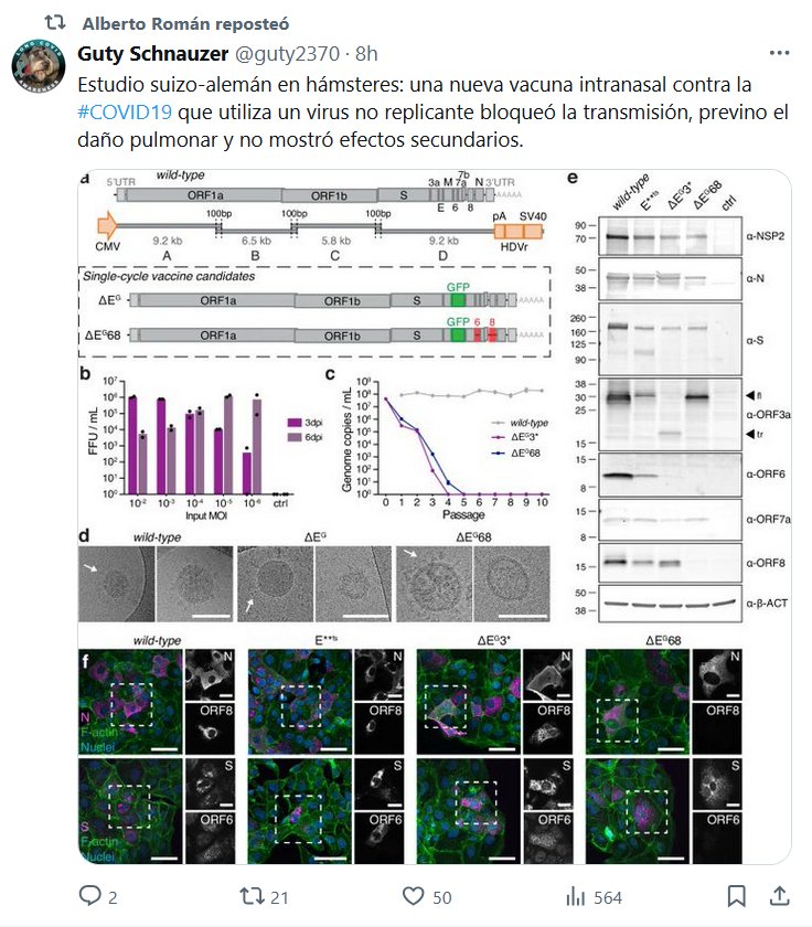 Estudio suizo-alemán en hámsteres: una nueva vacuna intranasal contra la #COVID19 que utiliza un virus no replicante bloqueó la transmisión, previno el daño pulmonar y no mostró efectos secundarios