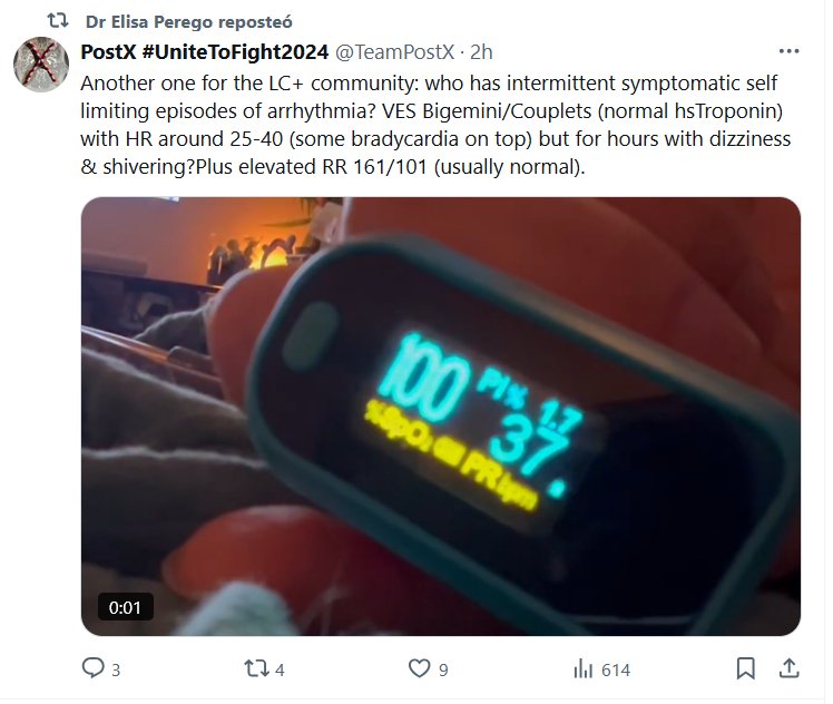 TESTIMONIOS LONGCOVID (EN INGLÉS) La Dra. Elisa Perego reposteó PostX #UniteToFight2024 @TeamPostX Otra para la comunidad LC+: ¿quién tiene episodios intermitentes sintomáticos de arritmia autolimitada? Bigemini/Couplets VES (hsTroponin normal) con FC alrededor de 25-40 (algo de bradicardia además) pero durante horas con mareos y temblores? Además de RR elevada 161/101 (normalmente normal)
