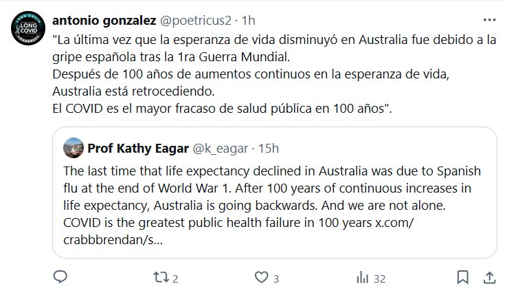 Y ASÍ EN EL RESTO DEL MUNDO «La última vez que la esperanza de vida disminuyó en Australia fue debido a la gripe española tras la 1ra Guerra Mundial. Después de 100 años de aumentos continuos en la esperanza de vida, Australia está retrocediendo. El COVID es el mayor fracaso de salud pública en 100 años»