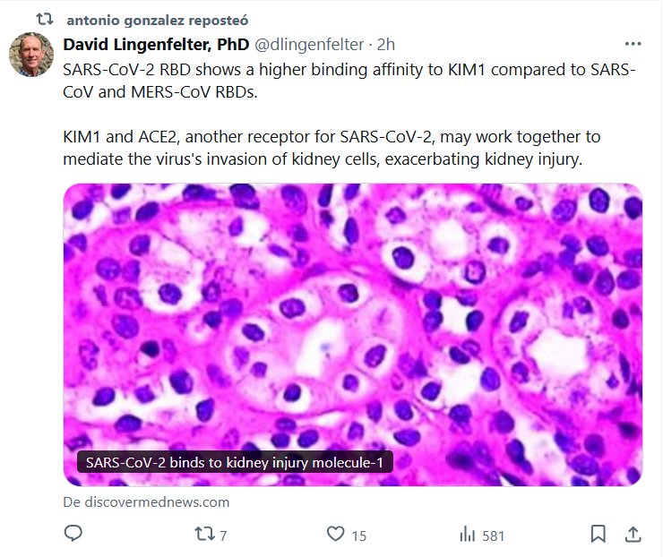 EN INGLÉS: DR. David Lingenfelter, PhD @dlingenfelter El receptor de dominio RBD del SARS-CoV-2 muestra una mayor afinidad de unión a KIM1 en comparación con los receptores de dominio RBD del SARS-CoV y el MERS-CoV. KIM1 y ACE2, otro receptor del SARS-CoV-2, pueden trabajar juntos para mediar la invasión del virus a las células renales, lo que agrava la lesión renal